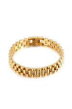 Our stainless steel watch strap bracelet in plated in 18K gold. Inspired by classic luxury watchbands, this bracelet will make a statement on its own. Wear it by itself or stack it with other bracelets. Comes in gold, silver and mix.